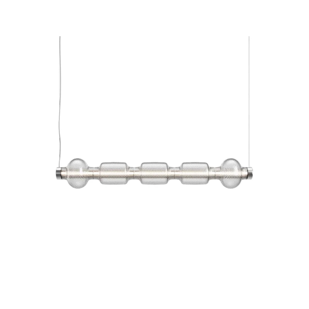 Alambicco è un corpo illuminante modulare che valorizza il vetro soffiato attraverso trasparenze e texture che modulano la luce con delicatezza. Al centro si trova una struttura in alluminio estruso con circuiti LED su quattro facce, vero cuore tecnologico attorno a cui si organizzano gli strati in vetro. Il primo è un cilindro zigrinato, pensato per rifrangere la vista dei componenti interni senza nasconderli del tutto, offrendo un’emissione uniforme e priva di abbagliamento. A questo si sovrappongono diffusori morbidi e trasparenti, realizzati con una lavorazione artigianale ispirata alla tecnica del balloton, che arricchisce la luce di una texture vibrante e preziosa.