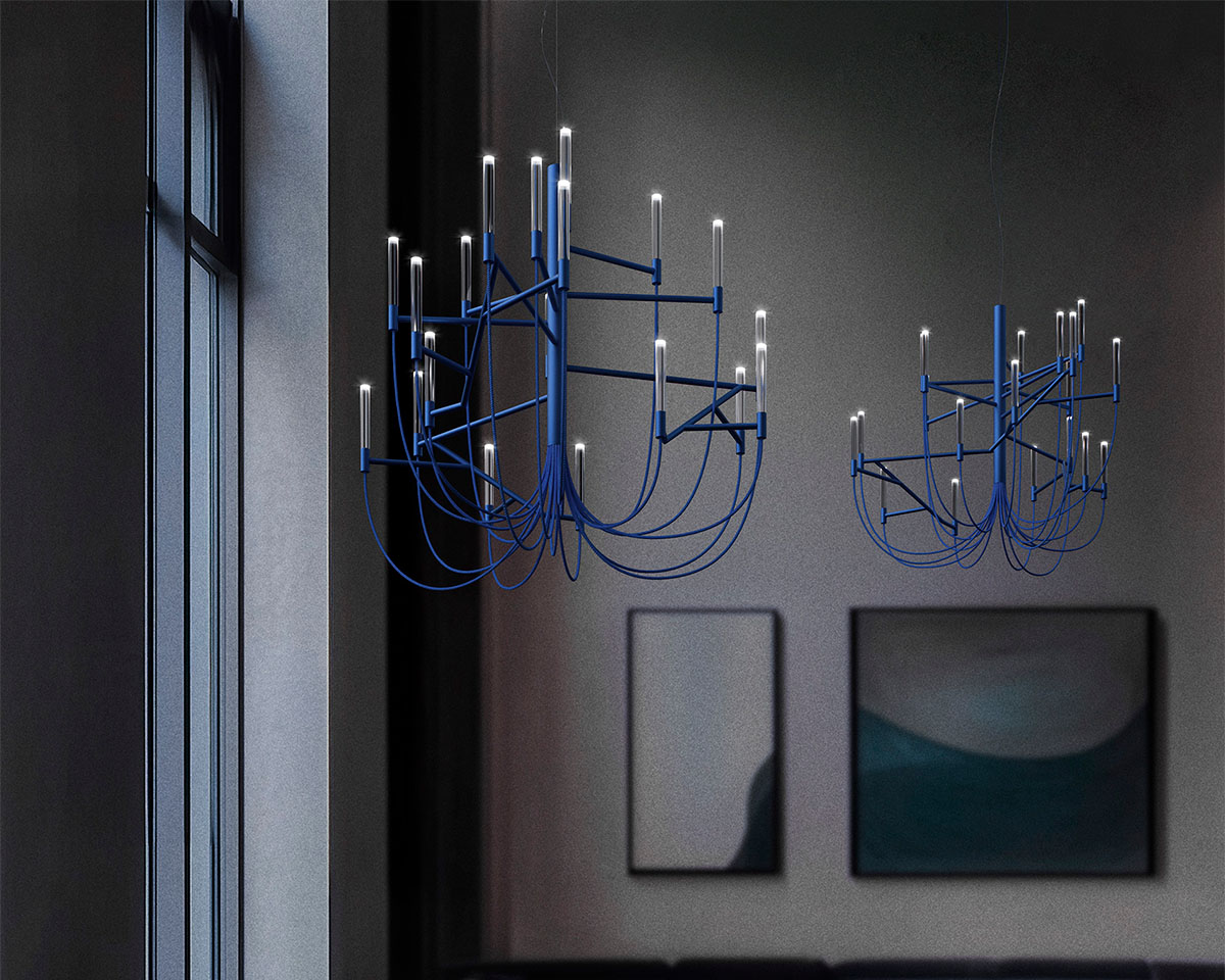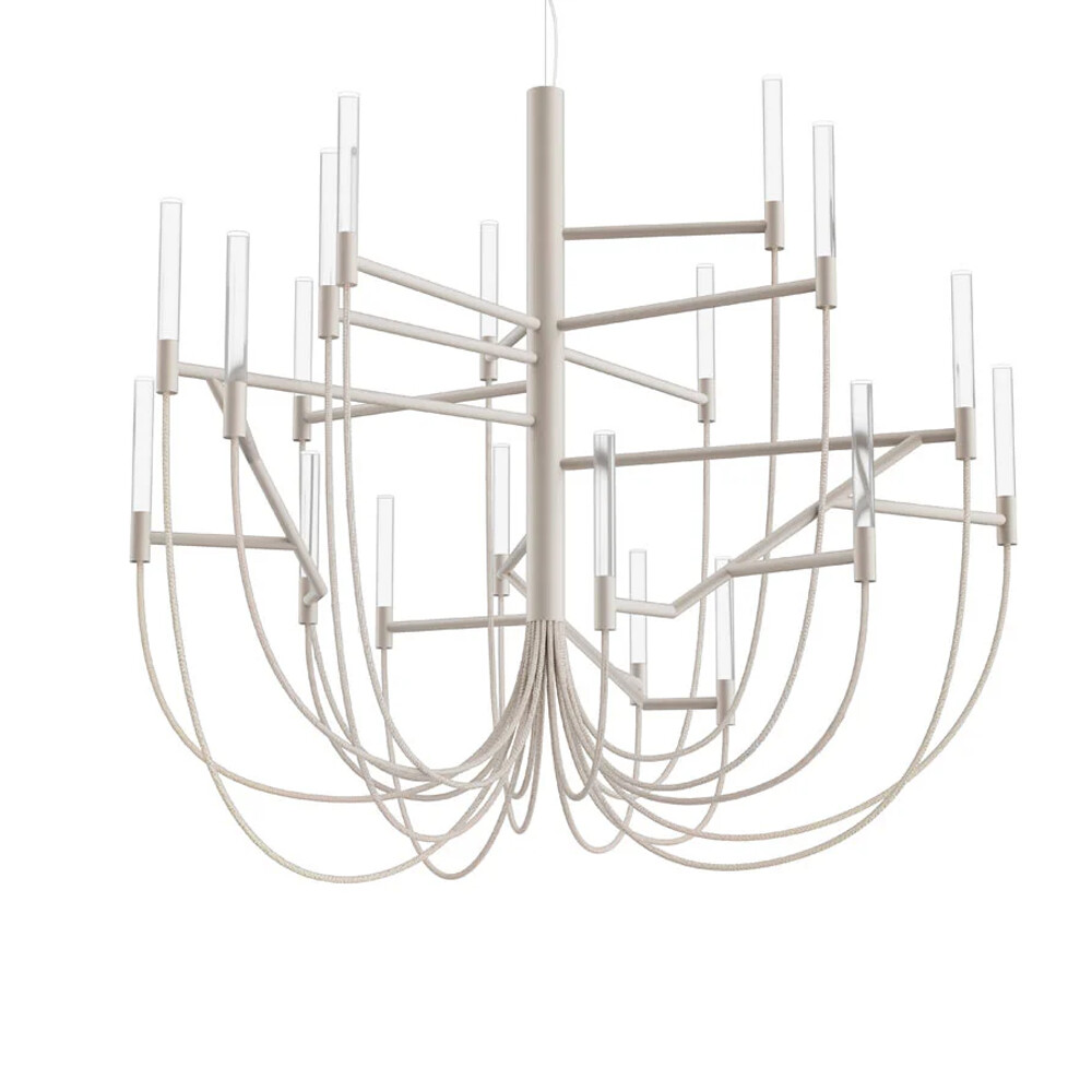 Allumette, firmata da Francesca Lanzavecchia per Foscarini, rilegge l’archetipo dello chandelier classico attraverso un segno scultoreo e poetico. Ispirata alla gestualità della luce delicata di un fiammifero, di cui riprende il termine francese, la sospensione gioca sul contrasto tra il rigore dei bracci metallici e la sinuosità dei cavi in tessuto modellati dalla gravità. Con i suoi diffusori in PMMA e una struttura che supera la simmetria tradizionale, Allumette trasforma la luce in un’architettura dinamica, capace di coniugare una forte presenza scenica a un’inedita leggerezza visiva.
