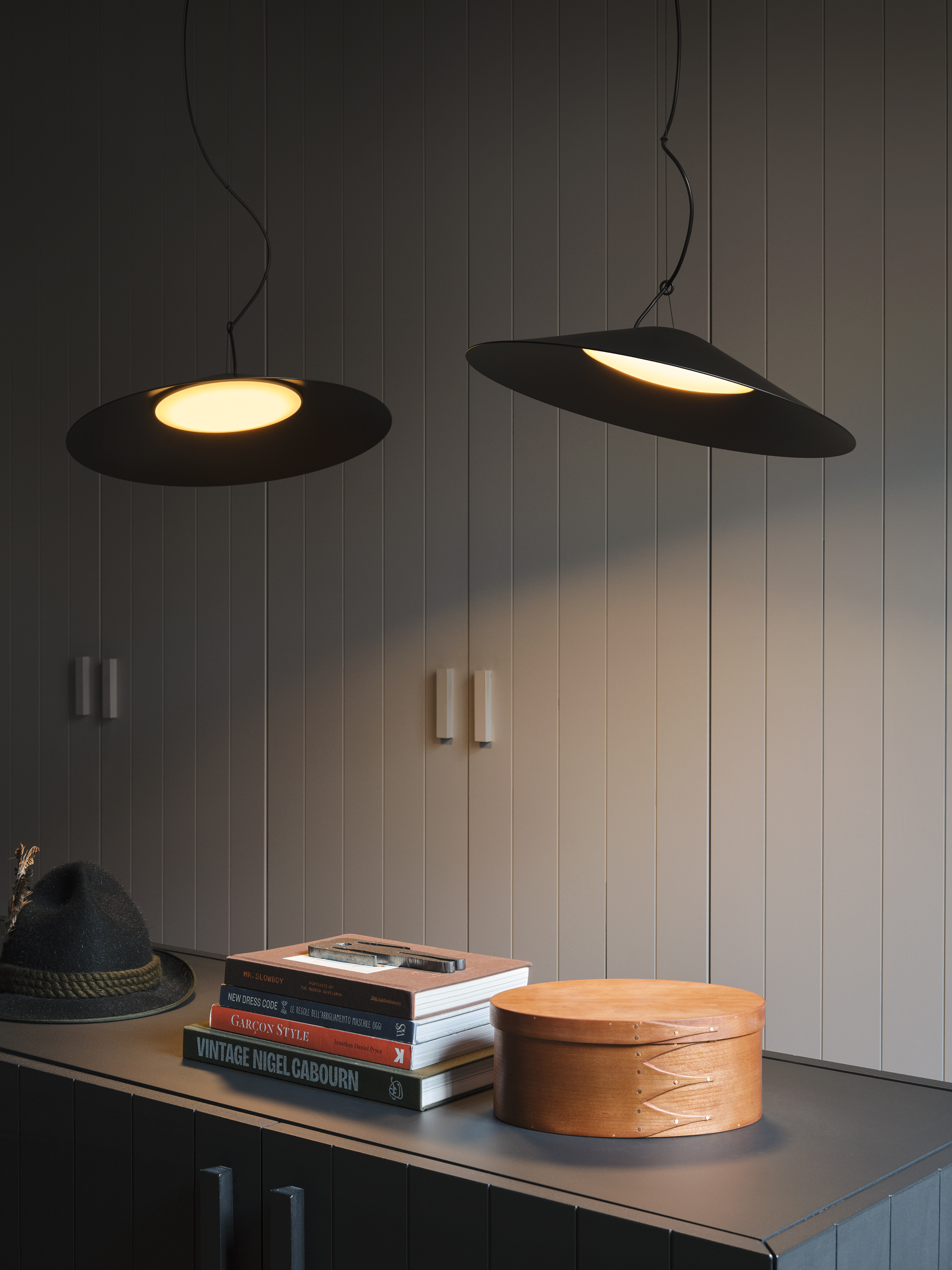 Architetture formali e dimensioni fuori dagli schemi. Il magnifico copricapo indossato dalla duchessa di Cambridge in occasione del 70º anniversario del giubileo inglese diventa fonte d'ispirazione per Kate, la plafoniera che ribalta le consuete percezioni dello spazio. Questa lampada, dalla sua figura conica, si dispone sul soffitto con un'inclinazione di 15 gradi, diffondendo la luce in modo inaspettato e aggiungendo un tocco emozionale all'ambiente circostante. Un connubio tra forme audaci e una prospettiva luminosa che trasforma l'esperienza visiva in un viaggio emotivo attraverso la luce. Disponibile anche come sospensione.