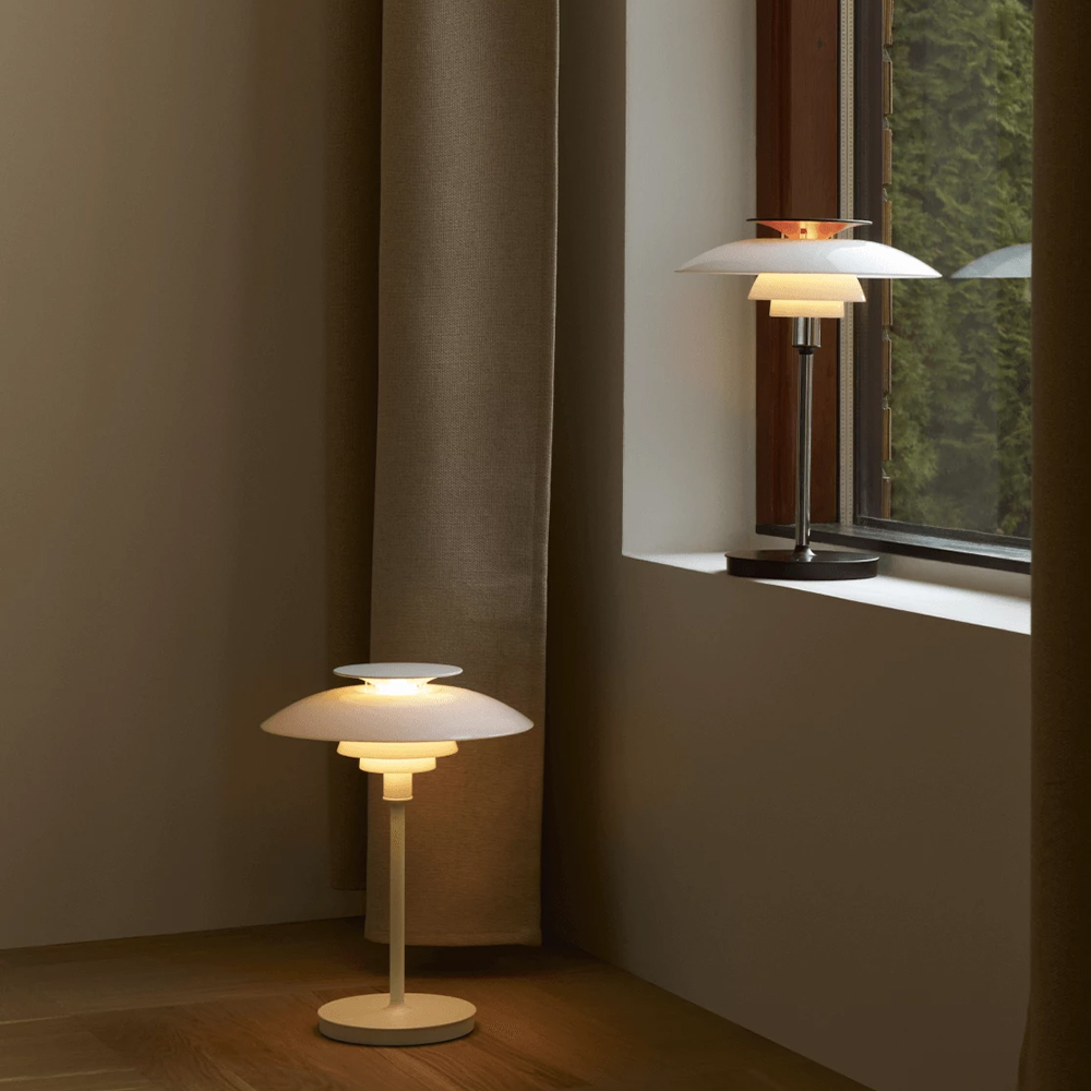 Poul Henningsen ha creato questa famiglia di prodotti nel 1925-1926, rivoluzionando l'illuminazione. In collaborazione con Louis Poulsen, queste lampade furono esposte a Parigi e segnarono l'inizio di una collaborazione che durò fino alla morte di Henningsen nel 1967. La sua visione era di creare una luce diretta ed anabbagliante, utilizzando lampadine a incandescenza per produrre ombre delicate. Henningsen non ha progettato solo lampade, ma un intero sistema con migliaia di modelli diversi, inclusi lampadari. Questa nuova versione Portable arricchisce ulteriormente la gamma rendendola completa per tutte le esigenze.