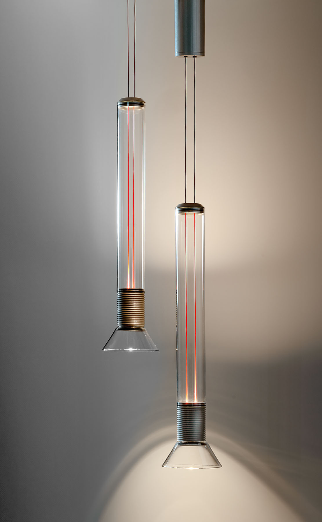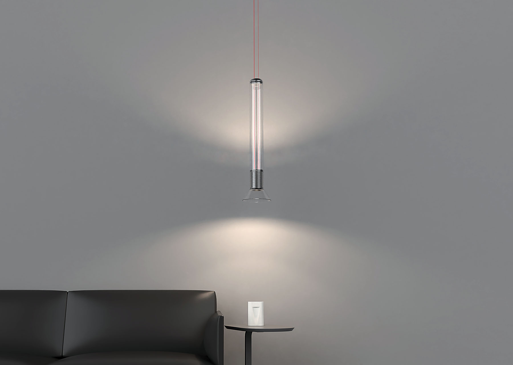 La lampada da sospensione e da terra Dia di Simon Schmitz è caratterizzata da una forte, ma leggera presenza visiva che arricchisce qualsiasi ambiente. Grazie ai suoi due potenti LED, può funzionare sia come faretto diretto che indiretto, o entrambi, offrendo così una versatilità unica nell'illuminazione.Il corpo della lampada, che sembra fluttuare nell’aria, nel caso della versione da sospensione è sostenuto da due sottili cavi di alimentazione colorati che non solo conducono l’elettricità, ma fungono anche da supporto strutturale, diventando un elemento chiave del design. Il posizionamento strategico delle sorgenti luminose LED è stato progettato per evitare l'abbagliamento, sia quando i LED sono rivolti verso il basso che verso l'alto.La struttura è in vetro e alluminio verniciato e l'alimentatore è a spina.
